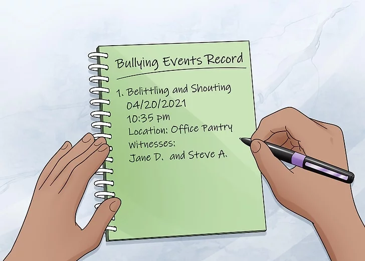 - Giữ một nhật ký về tất cả những sự kiện bắt nạt và giữ các bằng chứng như email hay tài liệu chỉ dẫn công việc để dùng cho khiếu nại của bạn.