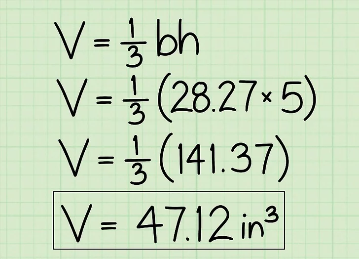 - Vậy, trong ví dụ này, thể tích của hình nón là 141,35 * 1/3 = 47,12.