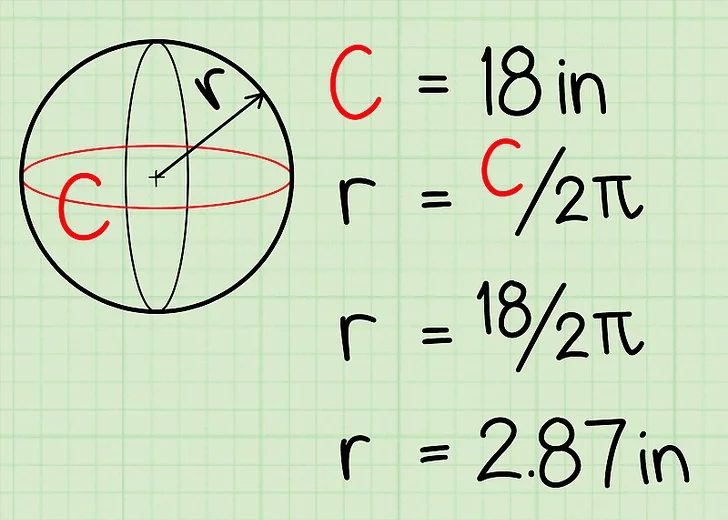 - Ví dụ, nếu bạn đo một quả bóng và có được chu vi của quả bóng là 18 inches, lấy số đó chia cho 6,28 và ta tìm được giá trị của bán kính là 2,87 in.
