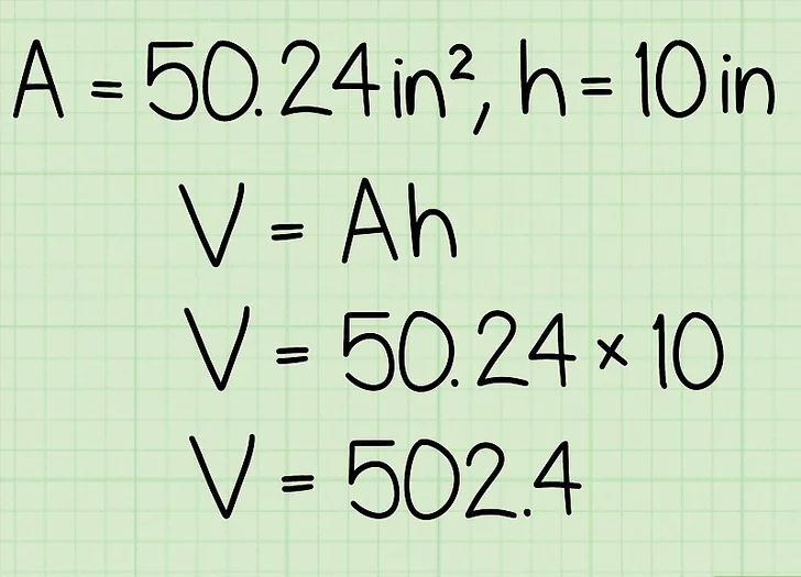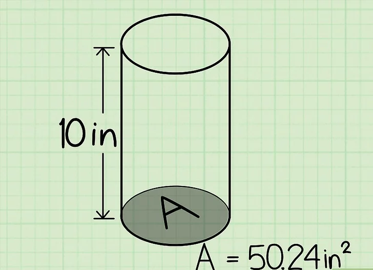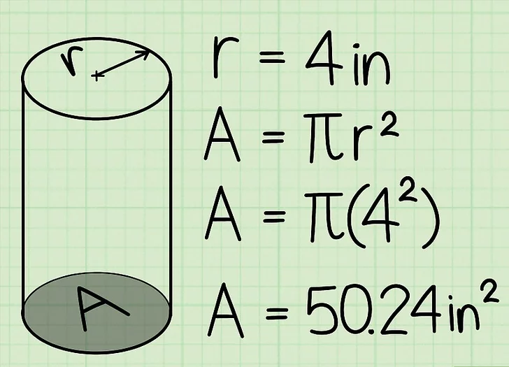 - Nếu bán kính của hình tròn là 4 inches (tương đương 10,16 cm), diện tích của mặt đáy sẽ là A = π42.