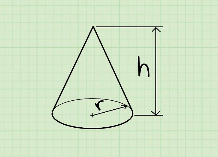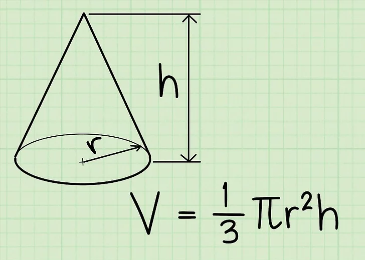 2 Công thức tính thể tích hình nón. V = 1/3πr2h là công thức tính thể tích một hình nón bất kỳ, trong đó r là bán kính mặt đáy, h là chiều cao của hình nón và π là hằng số pi, ta có thể làm tròn và lấy giá trị của π là 3,14.