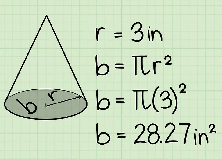 - Với ví dụ đưa ra trong giản đồ, bán kính mặt đáy của hình nón là 3 inches. Thay giá trị này vào công thức, ta có: A = π32.