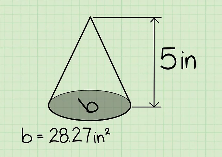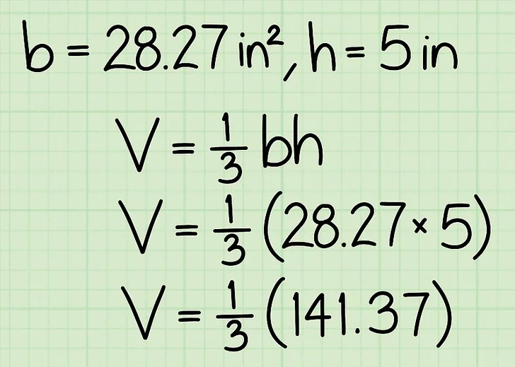 5 Nhân diện tích mặt đáy với chiều cao của hình nón. Ở ví dụ này, diện tích của hình nón là 28,27 in2 và chiều cao là 5 in, vậy bh = 28,27 * 5 = 141,35.