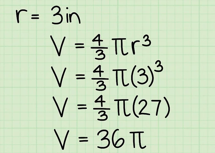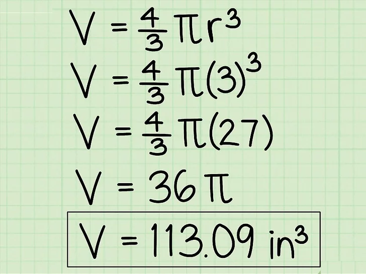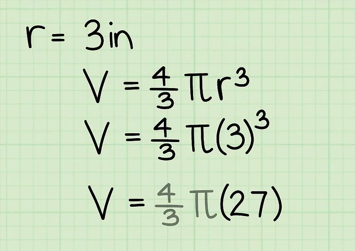 5 Mũ 3 bán kính đã có để được r3. Mũ 3 bán kính chính là nhân bán kính với chính nó 3 lần, vậy r3 = r * r * r. Trong ví dụ mà ta đang xét, r = 3, vậy r3 = 3 * 3 * 3, hay bằng 27.