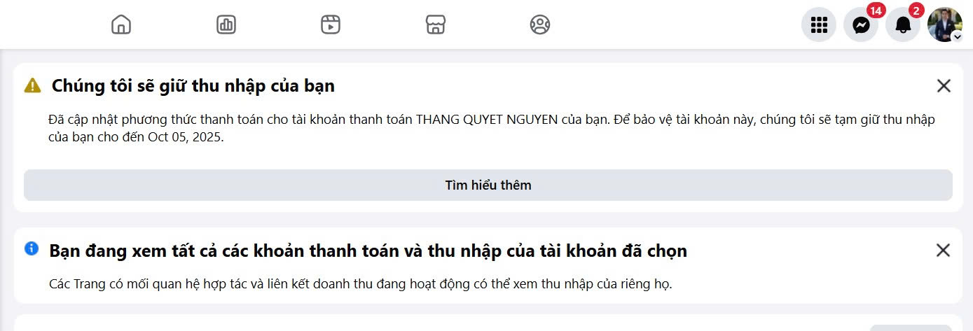 – Sau khi add thẻ và khai báo thuế thành công, bạn sẽ nhận được thông báo tạm giữ tiền trong 5 ngày để Facebook kiểm tra xem bạn có vi phạm chính sách gì trước khi chi trả không: