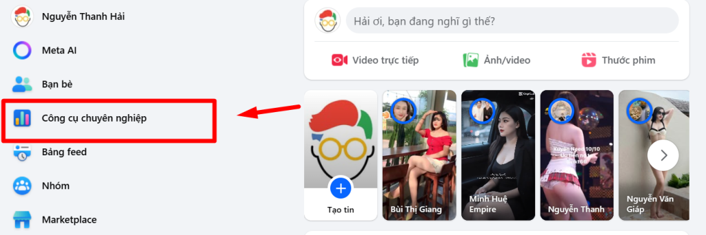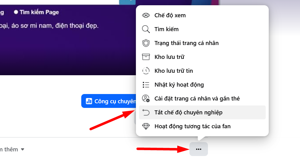 Tại trang chủ của Facebook cá nhân, bấm vào dấu ba chấm này để bật CHẾ ĐỘ CHUYÊN NGHIỆP. Ai đã bật rồi thì thôi.