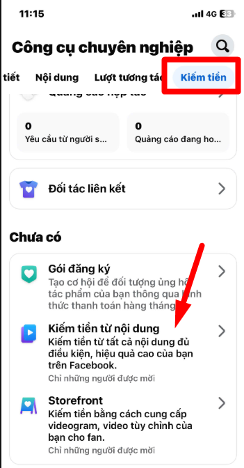 Tại tab KIẾM TIỀN, chọn KIẾM TIỀN TỪ NỘI DUNG